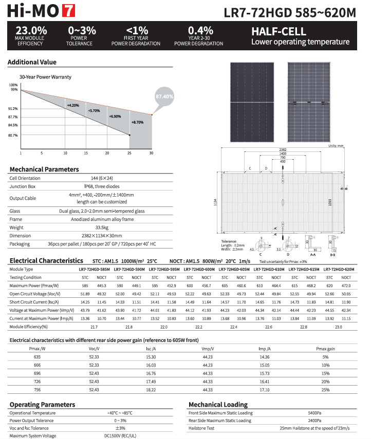 2382*1134*30, 33.5kg 최대효율 23%(620W기준)